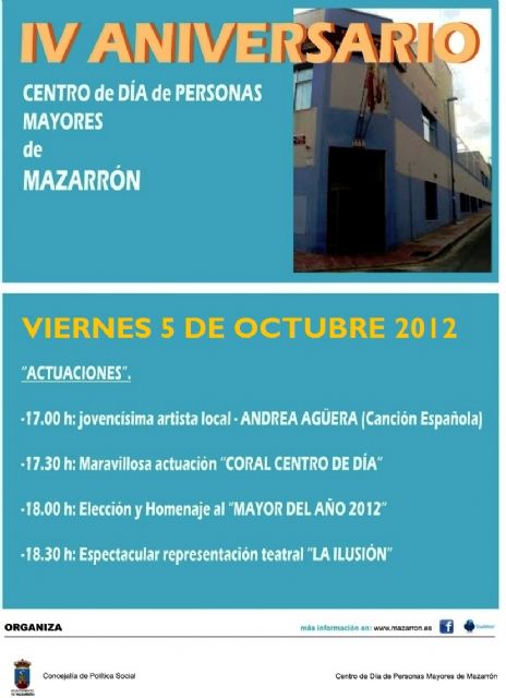 Ante la inestabilidad y los problemas que estaba produciendo el tiempo atmosférico el pasado viernes, el IV Aniversario del Centro de Día de Mazarrón fue aplazado para evitar riesgos a los mayores y ciudadanos que se iban a dar cita para celebrar su cuarto año de vida. Ahora, la fiesta tendrá lugar este viernes 5 de octubre con la misma programación que se había preparado para la pasada semana.