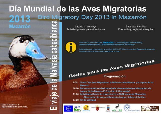 Con motivo de este día, la concejalía de Medio Ambiente del Ayuntamiento de Mazarrón ha organizado, en colaboración con la Asociación de Naturalistas del Sureste (ANSE), una serie de actividades en el marco del Proyecto "Conservación de la malvasía cabeciblanca en la Región de Murcia. España". Las actividades programadas se desarrollarán en el propio consistorio y en las lagunas de la rambla de "Las Moreras", humedal de importancia internacional incluido en la lista RAMSAR.