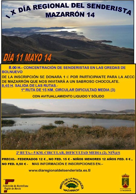 Por su parte, Salvador Inglés felicitó "al club senderista 'Amigos de la Naturaleza' por haber organizado la cita de este año para el disfrute de los senderistas de la Región de Murcia. Aunque siempre les apoyamos desde la Federación, los clubes son los que llevan todo el peso con el único objetivo y satisfacción de hacer algo por su localidad. Gracias por recoger el testigo" declaró Inglés. Los participantes federados pagarán 12 euros y 6 euros si son niños, mientras que los adultos no federados pagarán 15 euros y los niños 8,50 euros. Inscripciones en www.diaregionalsenderista.es.tl .