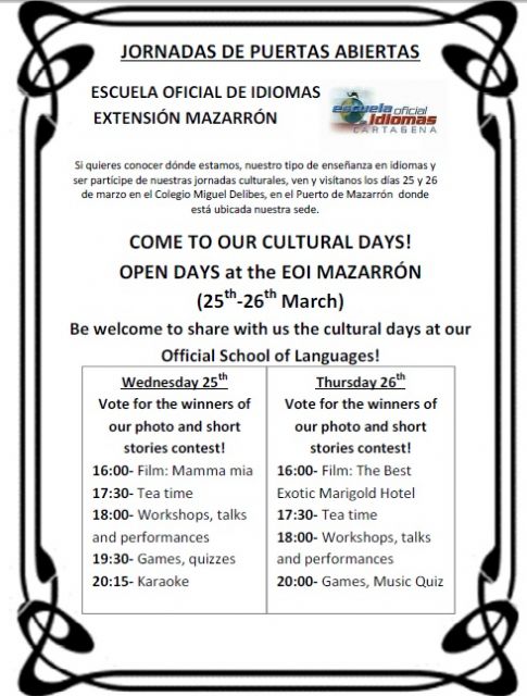 La extensión de Mazarrón de la Escuela Oficial de Idiomas acoge el miércoles y el jueves de esta semana sus jornadas de puertas abiertas. Ubicada en las instalaciones del CEIP Miguel Delibes de Puerto de Mazarrón, ofrecerá diferentes actividades recreativas y culturales desde las 16:00 horas hasta pasadas las 20:00 horas de los días 25 y 26 de marzo. De esta forma sus responsables quieren dar a conocer el tipo de enseñanza así como las modalidades que ofertan.