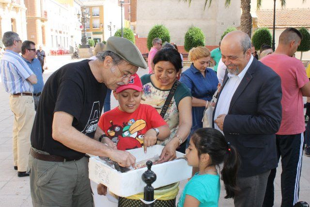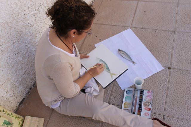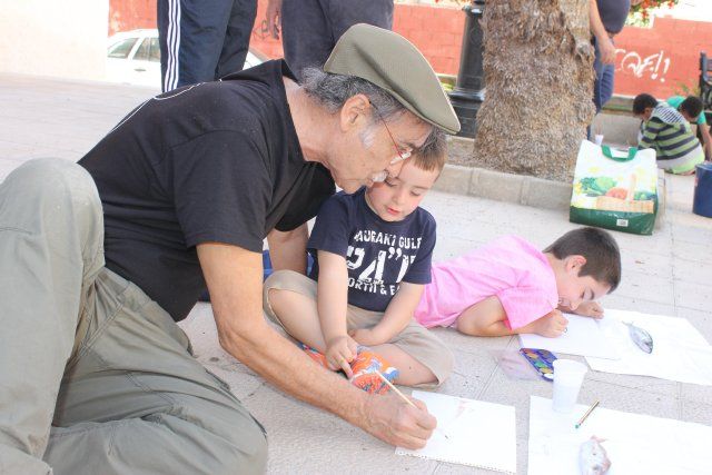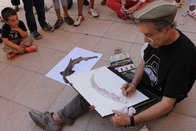 Niños y adultos han disfrutado en la mañana de este sábado de una jornada junto al prestigioso pintor de Blanca, Pedro Cano que desde el 21 de marzo expone en Casas Consistoriales una colección de acuarelas bajo el título "Peces" y en la que rinde homenaje al medio marino y a sus capturas, rememorando así detalles de su niñez cuando vendía pescado con su familia.