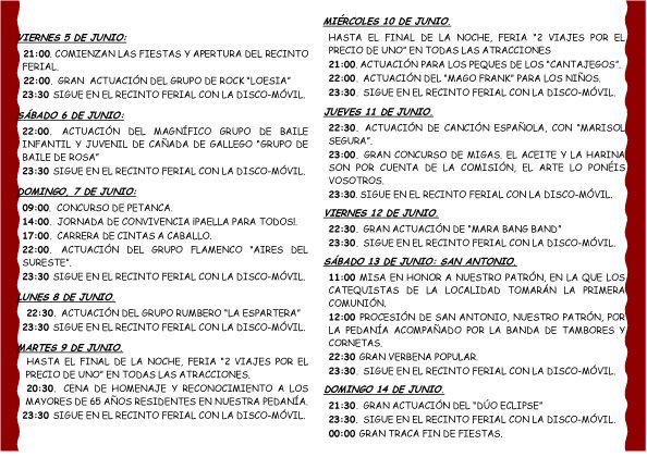 El sábado 6 de junio, a partir de las 22 horas tendrá lugar la actuación del grupo de baile local "De Rosa". Seguirá la discomóvil a partir de las 23:30 horas. El domingo 7 de junio, a las 09:00 horas se celebrará un concurso de petanca. A las 14:00 horas, jornada de convivencia con paella para todos. Ya por la tarde, a las 17:00 horas, carrera de cintas a caballo y por la noche a las 22:00 horas, gran actuación del grupo flamenco "Aires del Sureste".