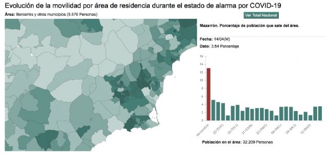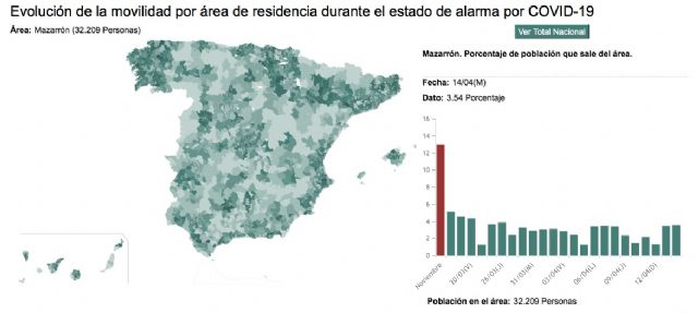 Según revela el 'Estudio de la movilidad de la población durante el estado de alarma' que ha elaborado el INE a partir de los movimientos de los teléfonos móviles,el porcentaje de habitantes de Mazarrón que ha salido fuera de su área de residencia desde que se decretó el confinamiento provocado por la pandemia de coronavirus es de los más bajos de la Región de Murcia, incluso de España.