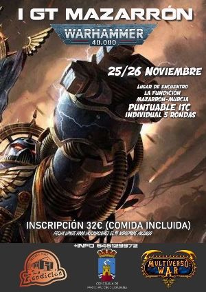 La Concejalía de Participación Ciudadana del Ayuntamiento de Mazarrón, liderada por el edil Juan Carlos López, ha organizado el ‘I GT Mazarrón – Warhammer 40.000’, un emocionante torneo entorno a este juego de miniaturas donde se mezclan elementos de ciencia ficción con fantasía heroica. Además de la colaboración municipal, el torneo cuenta con el patrocinio de Multiverso War y está organizado por el mazarronero Abel García.