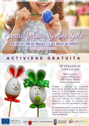 Al igual que la Navidad pasada, se incorpora el Espacio Inclusivo, una actividad que se suma a la Escuela de Semana Santa. Su desarrollo tendrá lugar en las correspondientes aulas abiertas del CEIP Francisco Caparrós (Mazarrón) y CEIP Miguel Delibes (Puerto de Mazarrón), dirigido a personas con diversidad funcional, desde 0 hasta 12 años, y aquellas mayores de 13 años empadronadas en Mazarrón o usarías de centros ubicados en el municipio.