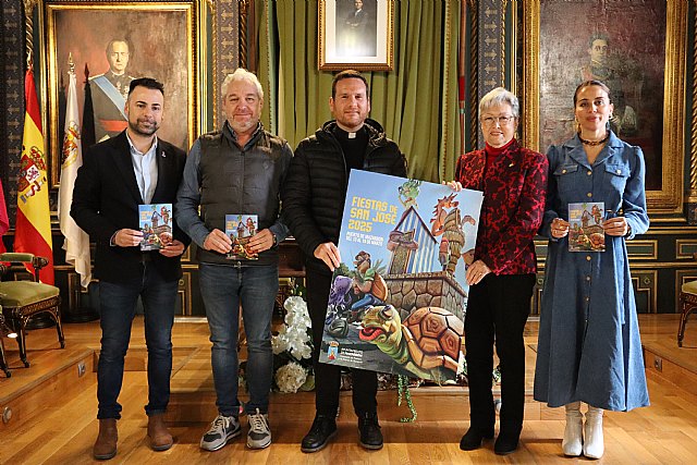 El alcalde de Mazarrón, Ginés Campillo, junto al concejal de Festejos, Miguel Ángel Peña, la concejal del Puerto, Ana Ruiz, el párroco del Puerto, Pablo Caballero, y la pregonera de las fiestas de San José, María Dolores de Haro, han presentado la esperada y completa programación de las Fiestas Patronales de San José, que se celebrarán del 13 al 19 de marzo de 2025 en el Puerto de Mazarrón.