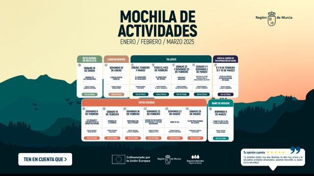 La Consejería de Medio Ambiente, Universidades, Investigación y Mar Menor presenta la nueva programación de la 'Mochila de Actividades' para los meses de enero, febrero y marzo de 2025. Los Espacios Naturales Protegidos de la Región de Murcia acogerán un total de 17 actividades destinadas a la educación y sensibilización ambiental, con el objetivo de fomentar el conocimiento y la conservación del entorno natural.